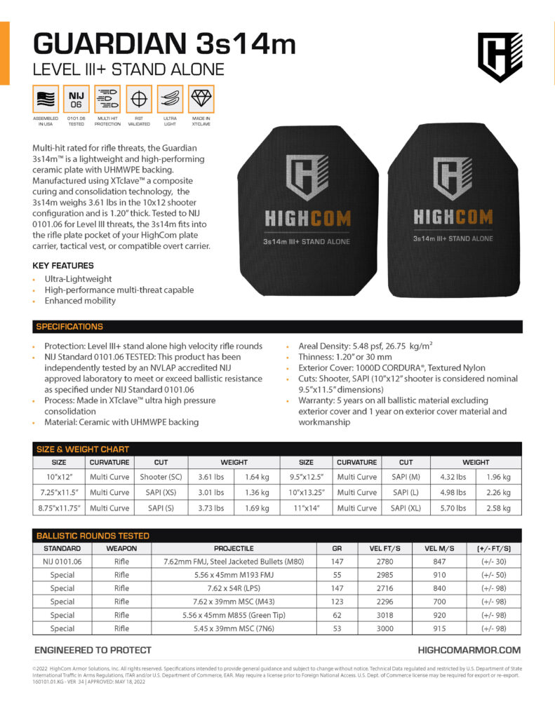 2. THE PRODUCTS ARE PROVIDED “AS IS” AND “WITH ALL FAULTS. (A) NEITHER HIGHCOM ARMOR DIRECT NOR ANY PERSON ON HIGHCOM ARMOR DIRECT’S BEHALF HAS MADE OR MAKES ANY EXPRESS OR IMPLIED REPRESENTATION OR WARRANTY WHATSOEVER, INCLUDING WITHOUT LIMITATION ANY WARRANTIES OF: (i) MERCHANTABILITY; (ii) FITNESS FOR A PARTICULAR PURPOSE; (iii) TITLE; OR (v) PERFORMANCE OF PRODUCTS TO STANDARDS SPECIFIC TO THE COUNTRY OF IMPORT, WHETHER ARISING BY LAW, COURSE OF DEALING, COURSE OF PERFORMANCE, USAGE OF TRADE OR OTHERWISE, ALL OF WHICH ARE EXPRESSLY DISCLAIMED, AND (B) BUYER ACKNOWLEDGES THAT IT HAS NOT RELIED ON ANY REPRESENTATION OR WARRANTY MADE BY HIGHCOM ARMOR DIRECT, OR ANY OTHER PERSON ON HIGHCOM ARMOR DIRECT’S BEHALF. To the extent permitted under the California Song-Beverly Consumer Warranty Act, this product is sold “AS IS” and “WITH ALL FAULTS”. The entire risk as to the quality and performance of the product is with the Buyer. HighCom Armor Direct does not warrant that product descriptions or other content of this site is accurate, complete, reliable, current or error-free. HighCom Armor Direct are not an insurer, and bear no liability for any use, misuse, or failure to perform. By purchasing HighCom Armor Direct Products, Buyer, on its own behalf and on behalf of its successors and heirs assumes ALL risks of use or misuse, and agree not to hold HighCom Armor Direct, its dealers, distributors, supplier or other “partners” liable in any way and release HighCom Armor Direct its dealers, distributors, supplier or other “partners” from claims for any damages, injuries, or fatalities resulting from the use, misuse, or wrongful use of HighCom Armor Direct products. Buyer assumes all risk and liability resulting from use of the products, services, or information delivered hereunder, whether used singly or in combination with other products, services, or information. WHILE THE NATIONAL INSTITUTE OF JUSTICE (NIJ) STANDARDS ARE PUBLISHED TO ASSIST UNDERSTANDING THAT A PRODUCT IS DESIGNED TO STOP A BULLET OR OTHER PROJECTILE PER A SPECIFIED LEVEL OF PROTECTION (FOR REFERENCE ONLY PLEASE SEE: https://cjttec.org/equipment-standards/ THERE IS NO WARRANTY OR GUARANTEE THAT THE PRODUCTS WILL SO PERFORM OR STOP A BULLET OR OTHER PROJECTILE PER SUCH SPECIFIED LEVEL OF PROTECTION.  Products shall not be returned to HighCom Armor Direct without HighCom Armor Direct’s prior written permission at their sole discretion. No charge or expense incident to any claims will be allowed unless approved by an authorized representative of HighCom Armor Direct. If consent is provided by HighCom Armor Direct, the return policy is listed at Temp Link: HighCom Armor Direct Return Policy for Consumers.pdf