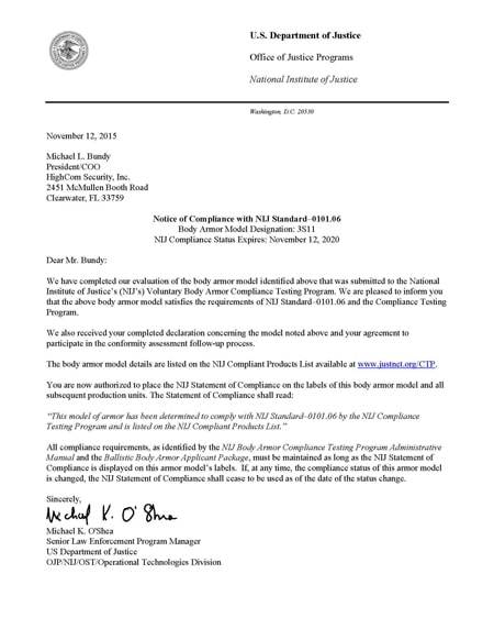 HighCom Model 3s11 NIJ Compliance Letter, NIJ Std 0101_06