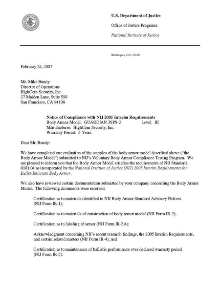HighCom Model 3sps2 NIJ Compliance Letter, NIJ Std 2005IR