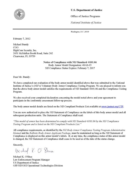 HighCom Model 4sas-15 NIJ Compliance Letter, NIJ Std 0101_06