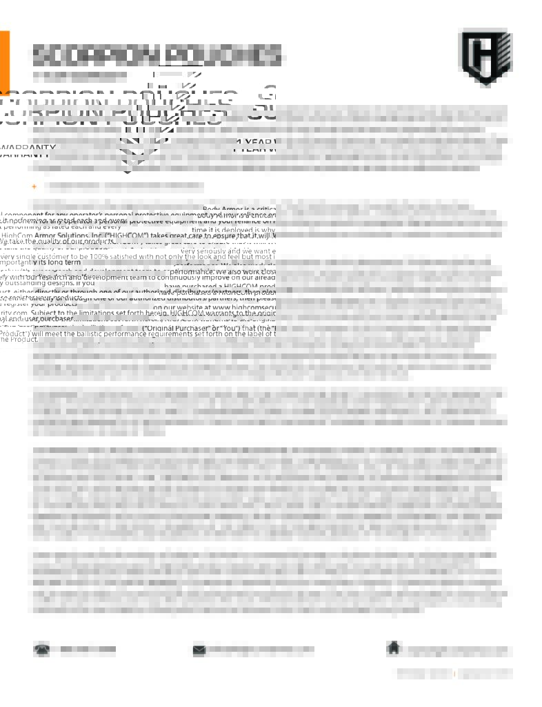WITH THE PURCHASE OF ANY BODY ARMOR OR BALLISTIC PROTECTIVE PRODUCT (the “Products”), BUYER’S ACKNOWLEDGES THAT IT IS UNDERSTOOD THAT THE PRODUCTS ARE NOT “BULLETPROOF”, NOR “BULLET-RESISTANT” EVEN IF PROPERLY MAINTAINED. ANY CLAIM OF COMPLIANCE WITH ANY STANDARD OR SPECIFICATION (INCLUDING NIJ STANDARDS) DOES NOT MEAN AND HIGHCOM ARMOR DIRECT LLC (“HIGHCOM ARMOR DIRECT”) AND ITS AFFILIATES DOES NOT SO WARRANT THAT THE PRODUCT WILL PREVENT BULLET PENETRATION,OR PROTECT AGAINST BALLISTIC THREATS, RIFLE FIRE, OR OTHER SHARP EDGED OR POINTED OBJECTS OR THAT THE IMPACT WILL NOT CAUSE INJURIES EVEN IF THE BULLET OR OTHER BALLISTIC THREAT IS STOPPED. IN ADDITION, THERE MAY BE ADDITIONAL “BEHIND ARMOR BLUNT TRAUMA (BABT) OR BEHIND HELMET BLUNT TRAUMA (BHBT) CAUSING A RISK FOR INJURY OR POTENTIALLY DEATH NOTWITHSTANDING USE OF ANY PRODUCTS. THESE INJURIES CAN RANGE FROM SEVERE BRUISES, BROKEN BONES, AND POSSIBLY INTERNAL INJURIES AND DEATH OR DISABILITY. IF STRUCK BY A BULLET EVEN WHILE USING BALLISTIC PROTECTIVE PRODUCTS, BUYER SHOULD SEEK IMMEDIATE MEDICAL ATTENTION TO ENSURE THERE ARE NO FURTHER INJURIES RESULTING FROM AN IMPACT. FAILURE TO FOLLOW STORAGE, USE, FITMENT, AND USE INSTRUCTIONS MAY IMPACT ON THE EFFICACY AND INTENDED PROTECTION OF OUR PRODUCTS AND THAT BUYER ASSUMES ALL RISK OF USE OF THE PRODUCTS. THE PARTIES AGREE THAT THE PURCHASE OF THE PRODUCTS IS SOLELY FROM HIGHCOM ARMOR DIRECT AND NO OTHER AFFILIATE THEREOF.